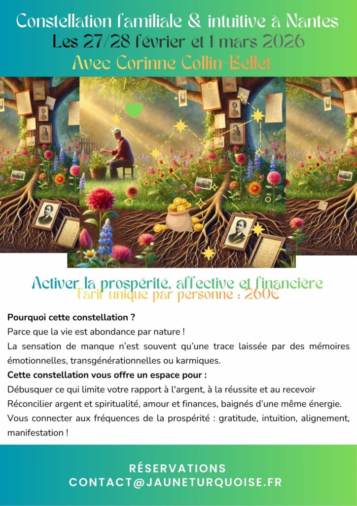 Parce que la vie est abondance par nature! La sensation de manque n’est souvent qu’une trace laissée par des mémoires émotionnelles, transgénérationnelles ou karmiques. Cette constellation vous offre un espace pour : Débusquer ce qui limite votre rapport à l’argent, à la réussite et au recevoir Réconcilier argent et spiritualité, amour et finances, baignés d’une même énergie. Vous connecter aux fréquences de la prospérité: gratitude, intuition, alignement, manifestation !